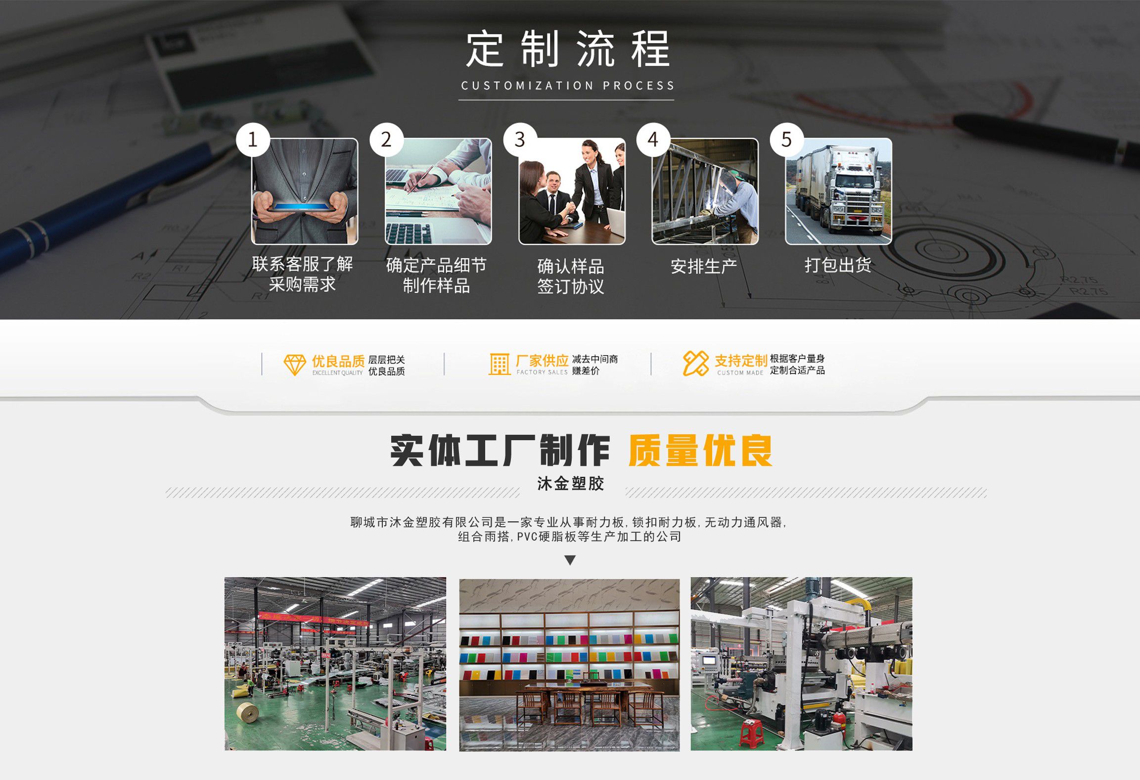 聊城市沐金塑膠有限公司注冊資金2180萬元,占地20000余平方,擁有自建廠房15000平方,員工100余名。10余年來,公司主營耐力板,鎖扣耐力板,耐力板深加工,無動力通風器,組合雨搭,PVC硬脂板,耐力板廠家等板材的發(fā)展戰(zhàn)略,逐漸成長為綜合性企業(yè)。 公司擁有多條板材共擠生產線,采用世界知名品牌進口原材料和先進工藝,依據完善的ISO9001質量管理體系和ISO14001環(huán)境管理體系,為產品的卓越品質提供了強有力的保證。憑借過硬的創(chuàng)新能力和堅實的硬件基礎,贏創(chuàng)已成為國內領先的熱塑性板材生產商,產品被廣泛應用于建筑業(yè)、農業(yè)、工業(yè)、廣告業(yè)、安防行業(yè)及DIY領域?! 」臼冀K致力于通過提供最優(yōu)的板材應用解決方案,為客戶創(chuàng)造最高的價值;堅守創(chuàng)新、質量、靈活、服務和速度的核心價值觀;堅持“完美的產品需要完美服務的支持”的經營理念,努力實現成為世界領先的板材與解決方案供應商的夢想?! ≡谖磥?,公司將立足客戶需求,不斷改變和完善現有產品,拓展產品線和充分開發(fā)板材的應用領域,為客戶創(chuàng)造全方位的價值。同時更好地實現員工的價值,實現公司團隊的價值。我們將與您一起創(chuàng)贏未來! 企業(yè)使命:成為世界領先的板材與解決方案供應商?! 」驹妇埃和ㄟ^提供最優(yōu)的板材應用解決方案,為客戶創(chuàng)造最高的價值?! 『诵膬r值觀:質量...
